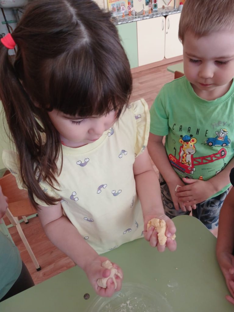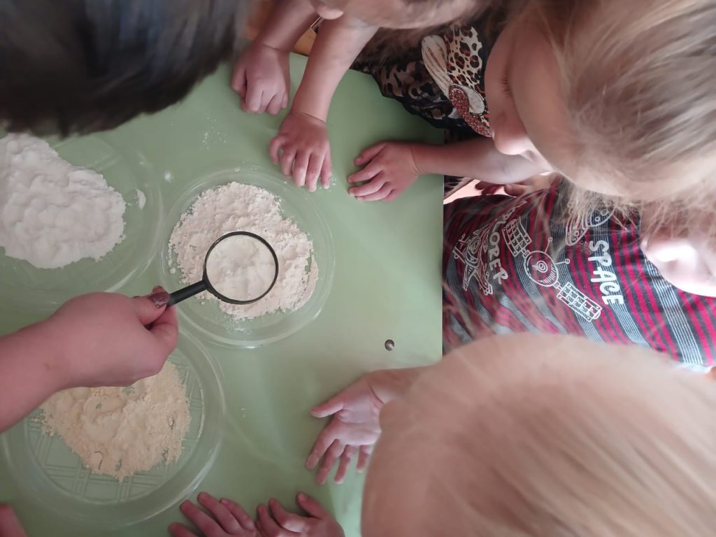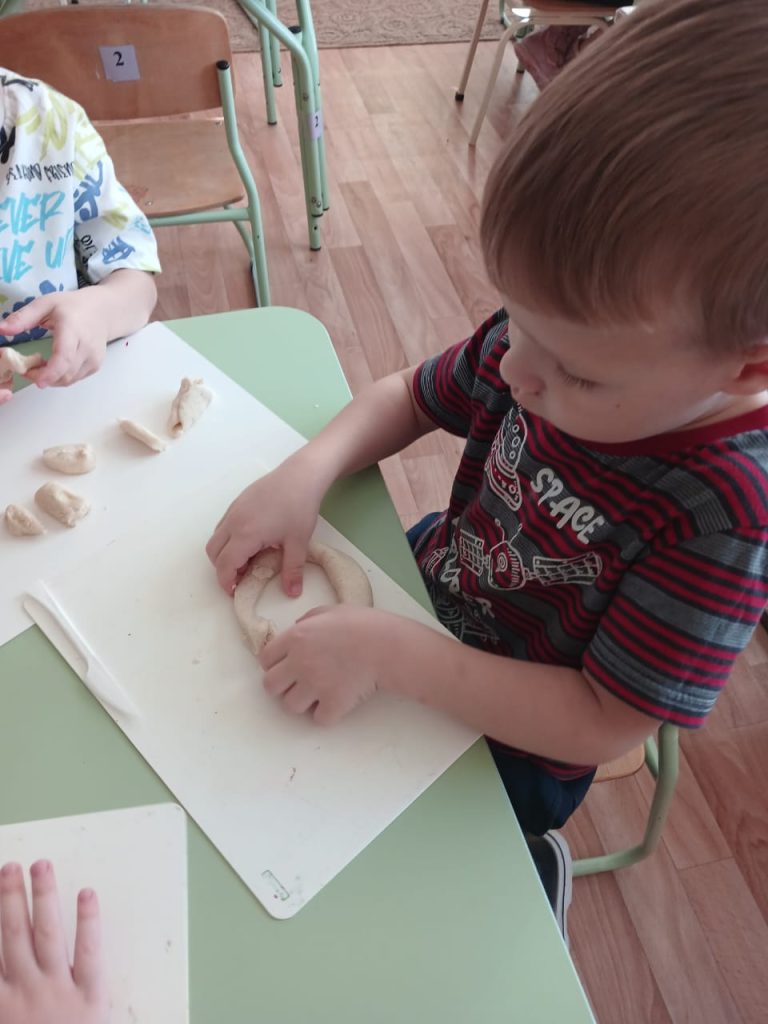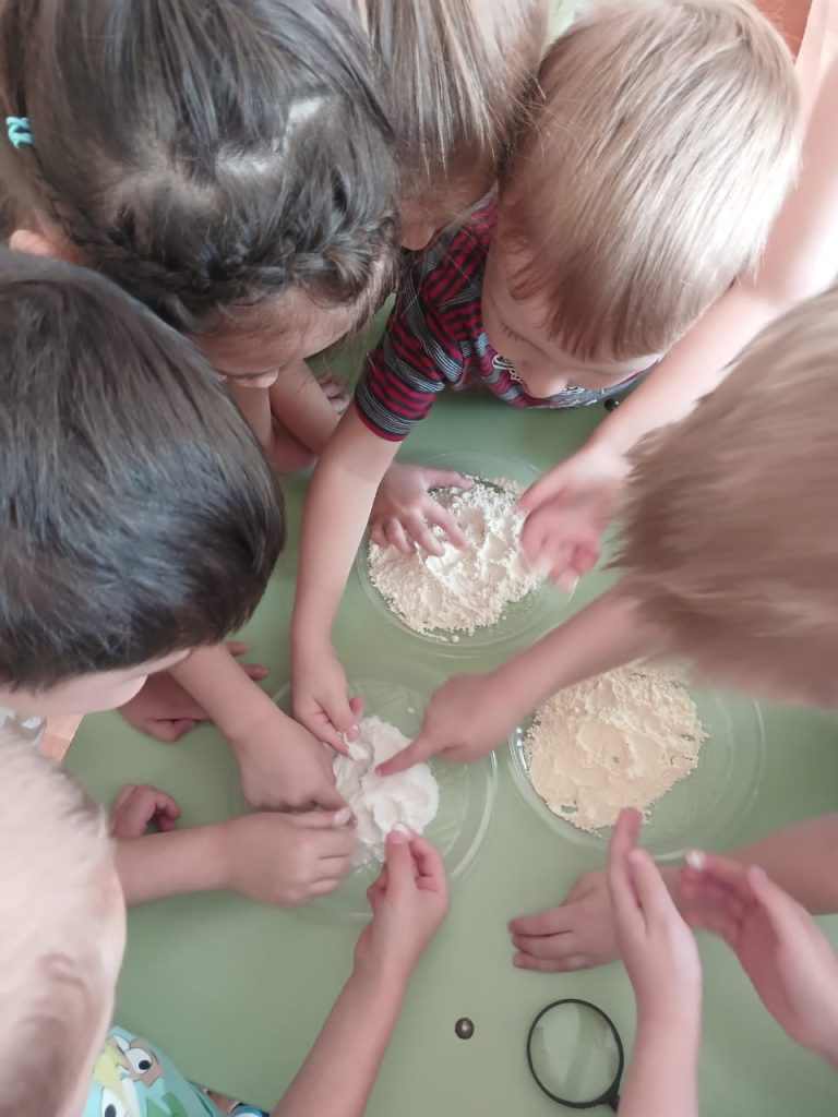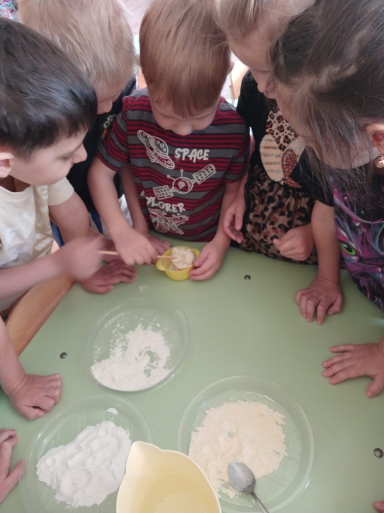 В рамках познавательно-исследовательской деятельности дети проследили путь хлеба – от зерна к столу. Рассмотрели колосья пшеницы и сами попробовали «добыть» зерна. Сравнили разные виды муки (кукурузная, рисовая, пшеничная), замесили тесто и слепили разные хлебобулочные изделия.