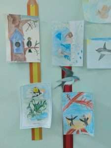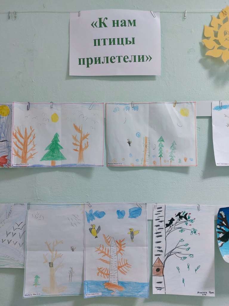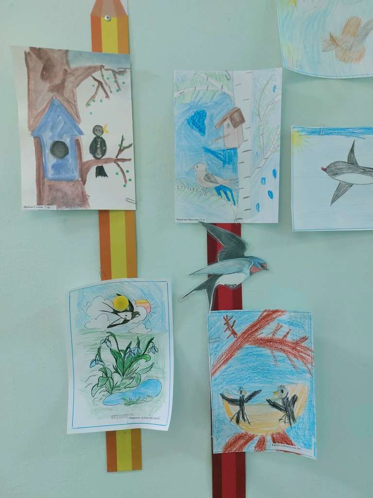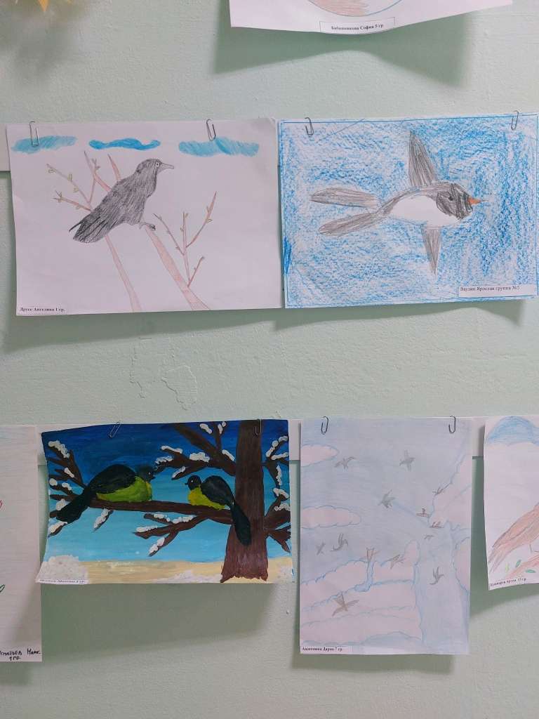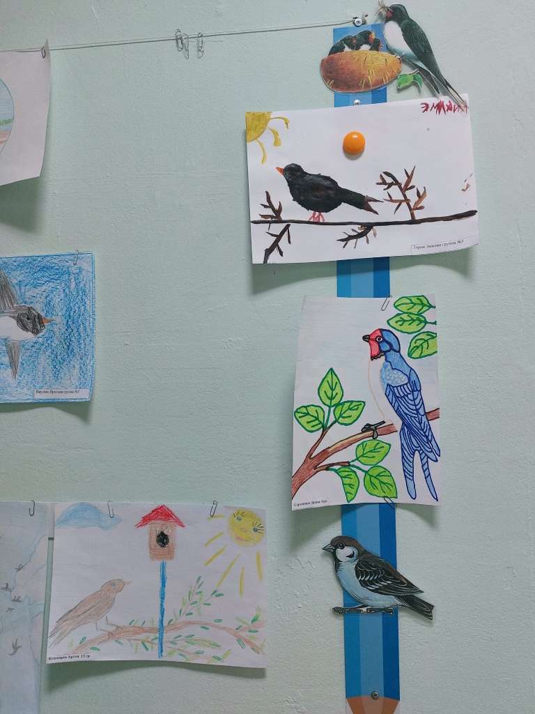 Воспитанники старших и подготовительных групп детского сада совместно с педагогами и родителями приняли участие в выставке рисунков “К нам птицы прилетели”.